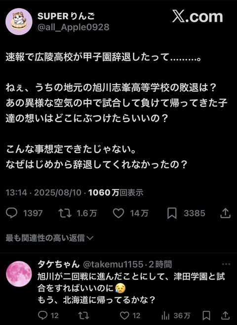 【悲報】旭川市民「広陵が甲子園辞退した?じゃあ旭川志峯高校の負けはどうなるの?」