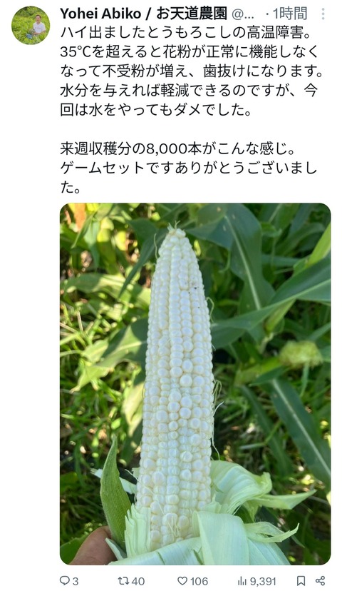 【悲報】とうもろこし農家、高温障害でゲームセット