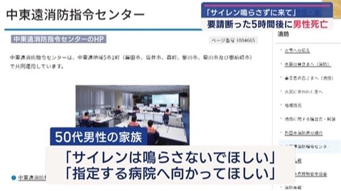 【静岡】50代男性「近所迷惑になるしサイレン鳴らさないで来て」救急車「無理」→男性、死亡…