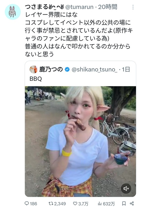 【悲報】コスプレイヤー鹿乃つのさん、ただコスプレしてBBQをしただけで炎上