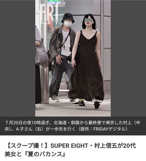 【悲報】ジャニタレ村上信五さん(43)、20代美女とラブラブ夏のバカンスを撮られるもストーカーみたいだと話題に フライデー砲