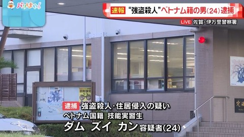 【悲報】佐賀県伊万里市の母娘強盗殺人事件でベトナム国籍の24歳男を逮捕