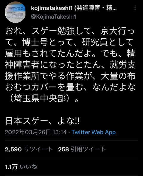 【悲報】京大博士元研究者「精神障害になって就労支援施設でおむつカバー畳んでます」