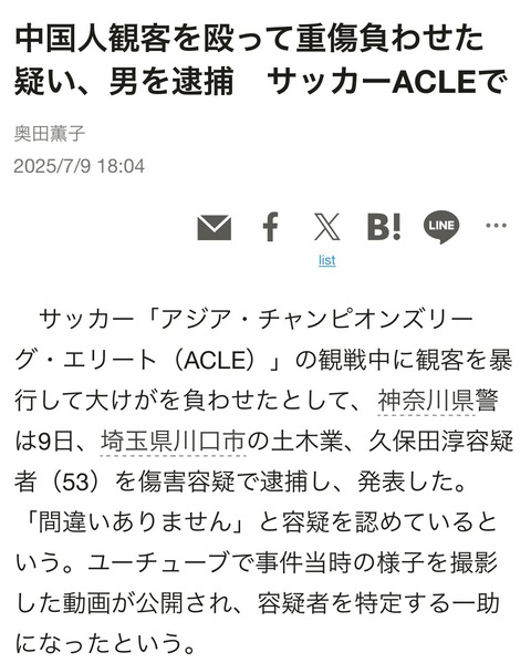 【爆報】中国人観客を殴って重傷負わせた疑い、浦和レッズサポを逮捕 サッカーACLE