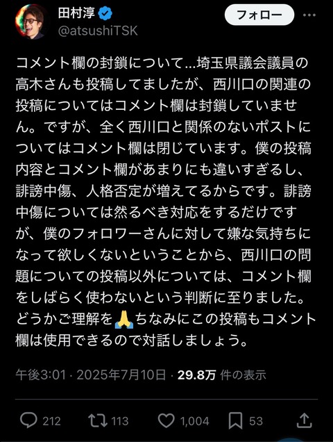 ロンブー田村淳さん、コメ欄を閉じたことについて声明発表