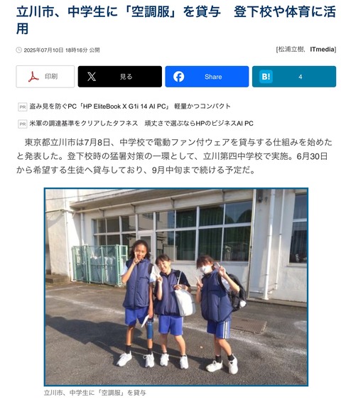 【速報】東京都、中学生に「空調服」を支給