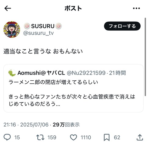 【悲報】SUSURU、二郎をとぼした奴に激怒
