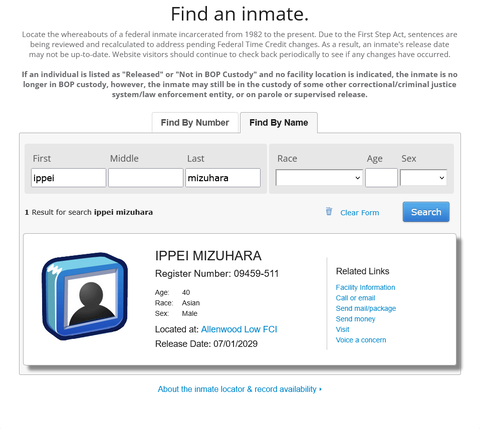 【悲報】水原一平さん、ペンシルバニア州連邦刑務所のホームページに登録される