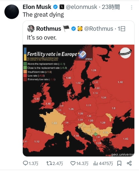 イーロンマスク、今まで日本に押し付けていた少子化問題が先進国全体の問題だと気づく