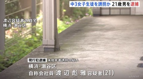 【悲報】横浜市瀬谷区の渡辺彪雅(ひゅうが)さん(21)、女子中学生(14)を自宅に連れ込んでたところを別居中の妻(18)に通報され未成年者誘拐の疑いで現行犯逮捕wwwwww