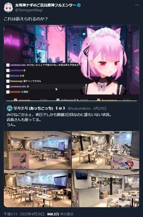 【悲報】みけねこさん、みけねこカフェがガラガラと伝えた人たちを訴えると宣言