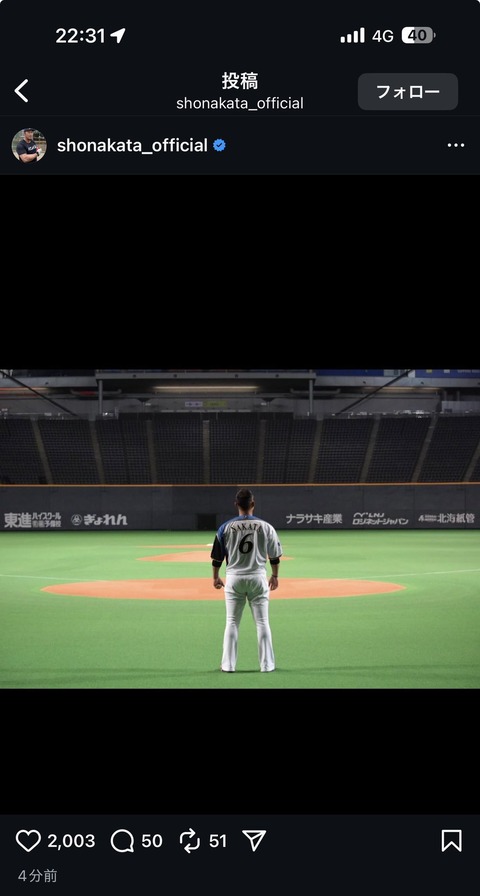 【速報】中田翔さん、インスタに謎の投稿をする・・・ 引退間際か