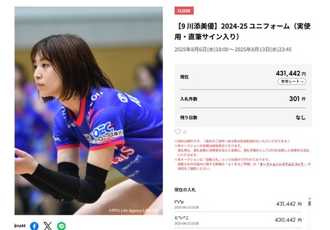 【画像】女子バレー選手の実使用ユニフォーム、約43万円で落札される