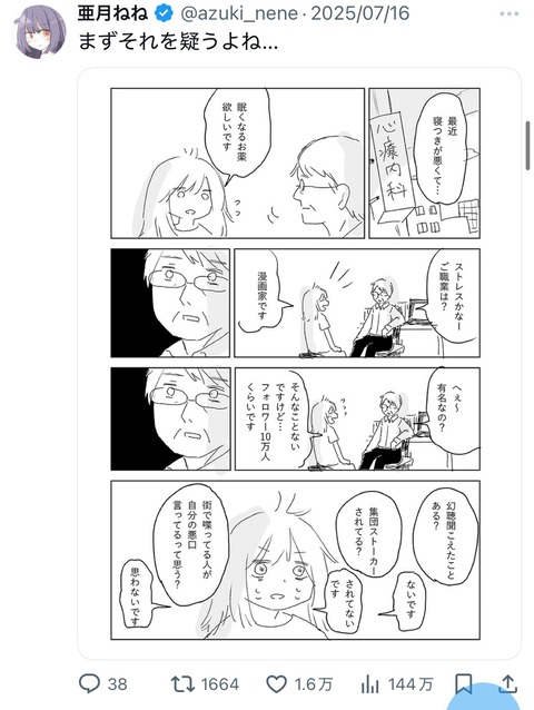 【悲報】漫画家の亜月ねね先生、病院で屈辱を受ける「医者に職業が漫画家だって言ったら、統失扱いされた!」