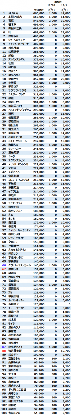 Vtuber にじさんじの12/21時点での登録者数比較!長尾も伸びてんな。