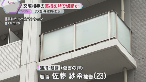 【ホラー】大阪市北区の23歳の佐藤紗希、彼氏の薬指を斧で乳首をハサミで切断し逮捕wwwww