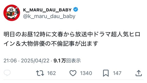 【文春砲】放送中ドラマ超人気ヒロインと大物俳優の不倫報道←ガレソが永野芽郁と田中圭だとバラしてしまうwwwwwww