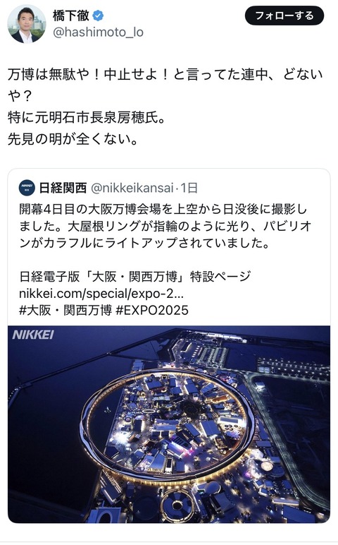 橋下徹、爆勝宣言「万博中止せよ言ってた連中、どないや!特に泉房穂!先見の明無し!」