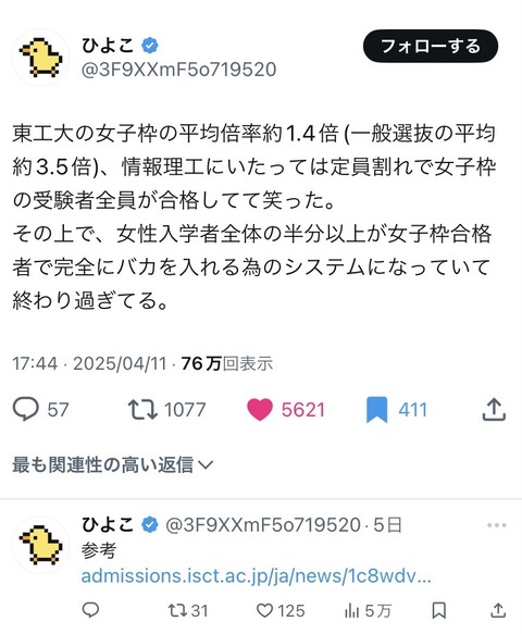 【悲報】東工大(東科大)さん、女子枠で定員割れが発生して受験者全員合格。Fラン大学になってしまう…