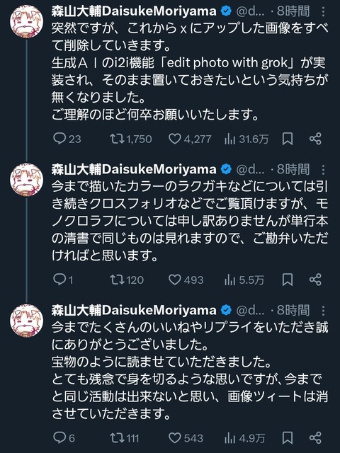 人気マンガ家の森山大輔先生「Xの画像全部消します。イラストも載せません。勝手に生成AIに使われたくないので。」