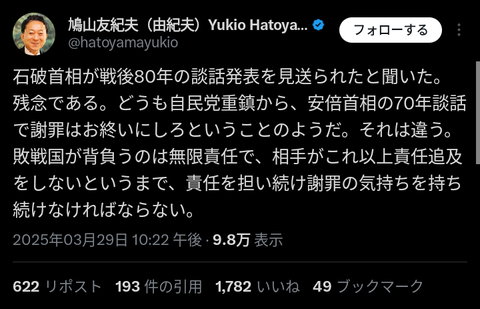 【悲報】鳩山由紀夫「敗戦国は無限責任だ。日本は永遠に謝罪し続けなくてはならない」