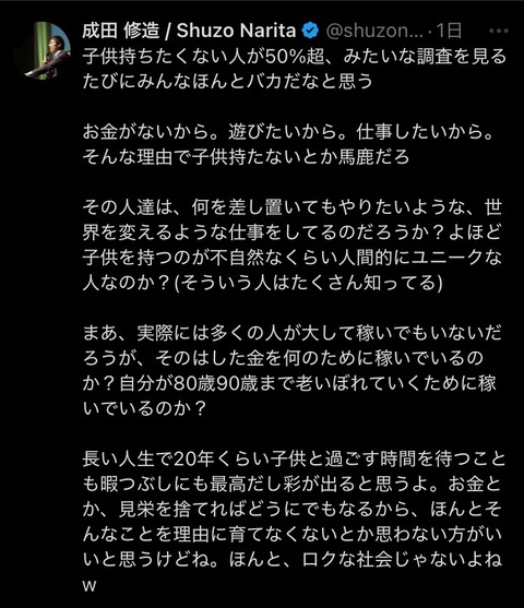成田修造(成田悠輔の弟)「子供持ちたくないとか言うやつってバカ、世の中変えるような仕事でもしてんの?」
