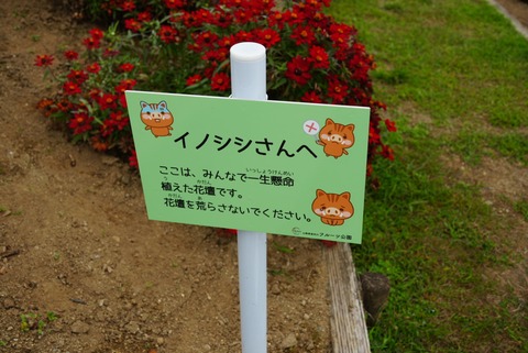 【画像】山梨の果樹園「イノシシさん、ここはみんなで作った花壇です。花壇を荒らさないでください」?