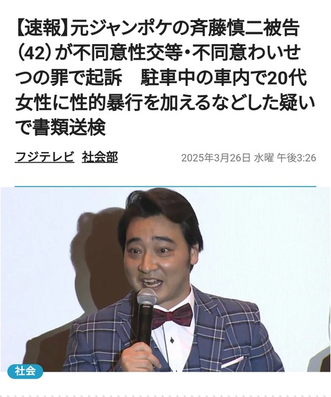 【速報】ジャンポケ斉藤メンバー性的暴行容疑で起訴