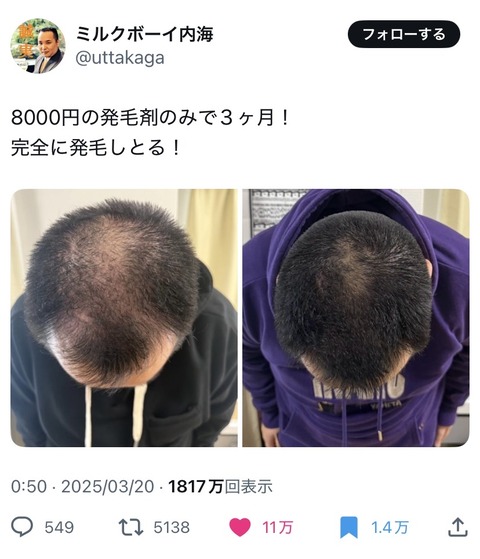 【画像】ミルクボーイ内海 頭皮が完全復活