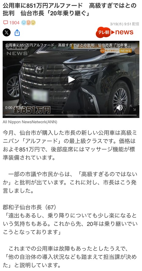 【悲報】仙台市長、851万円のアルファード購入で炎上・・・・・