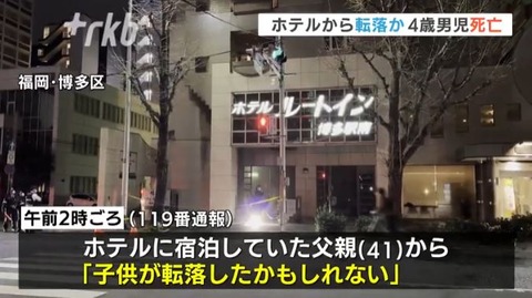 【悲報】福岡に家族旅行に来ていた4歳男児、宿泊先のホテルルートイン博多駅南から転落死
