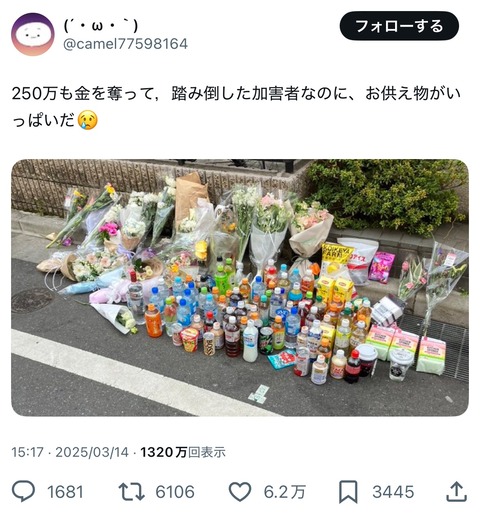 【画像】最上あいさん刺殺現場に大量のお供え物を見た人「250万も金を奪って,踏み倒した加害者なのに、お供え物がいっぱいだ?」←6万いいね