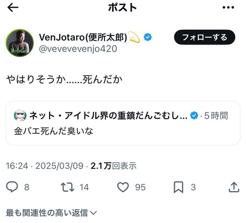 【悲報】金バエ、逝ったかもしれない。