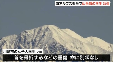 【朗報】南アルプスで400メートル滑落した女子大学生、首の骨を折るも命に別状なし
