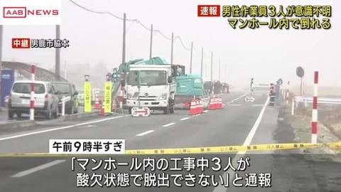 【秋田】男鹿市脇本樽沢の下水道工事のマンホール内で作業員3人倒れ死亡 周辺住民に注意喚起