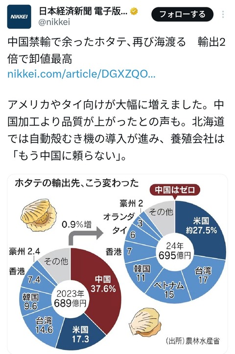 中国「もう日本産のホタテ買わんわ」日本「やめてえええ!」→結果www