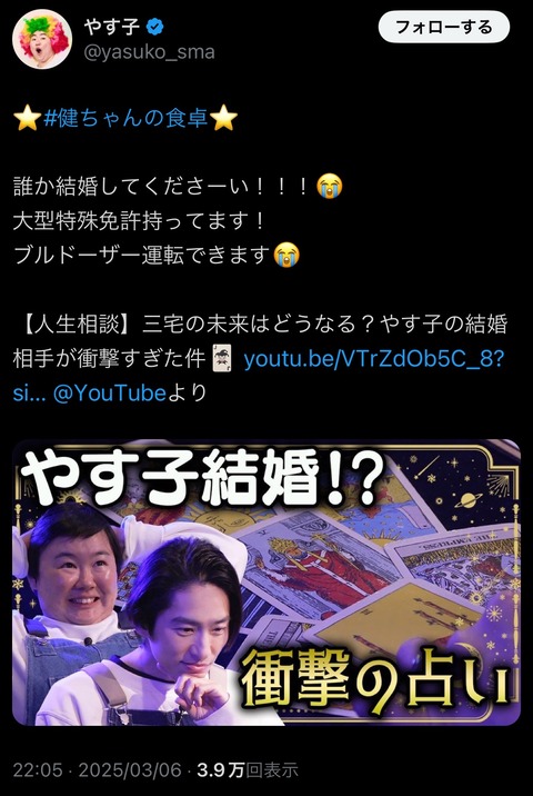 【朗報】やす子「誰か結婚してくださ~い?」お前ら急げ