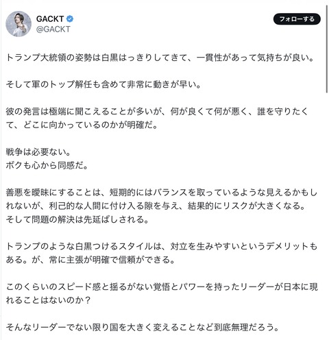 【悲報】GACKTさん、トランプ信者扱いされたので長文お気持ち表明wwwwww