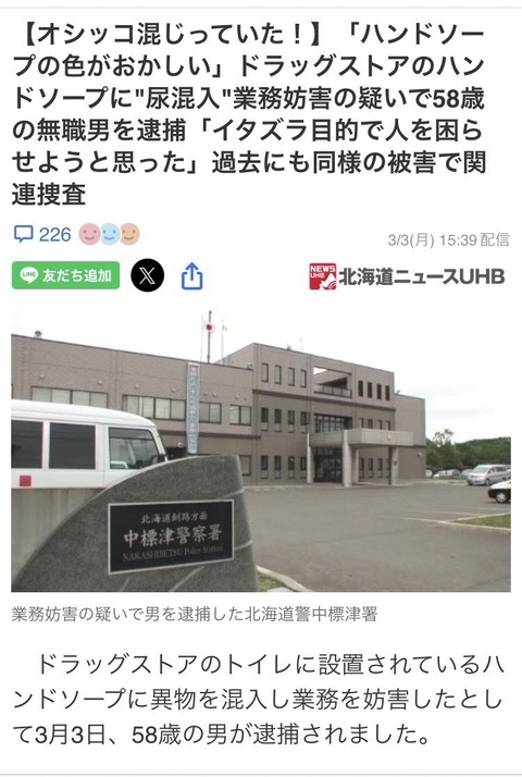 【試される大地】「ハンドソープの色がおかしい」ドラッグストアのハンドソープに"尿混入"業務妨害の疑いで58歳の無職男を逮捕