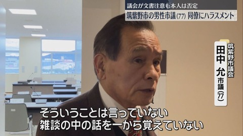【修羅の国】福岡県筑紫野市・田中允市議(77)、女性市議の腰を触り男性市議に注意され「ぶっ殺すぞ」と激怒