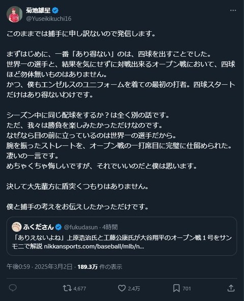 【朗報】大谷翔平にホームランを打たれた菊池雄星さん、サンモニの上原浩治さんにくぎを刺す