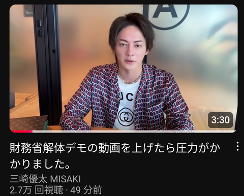【悲報】YouTuberの三崎優太さん、財務省解体デモ動画を上げた翌日に取引先の大手企業から切られる