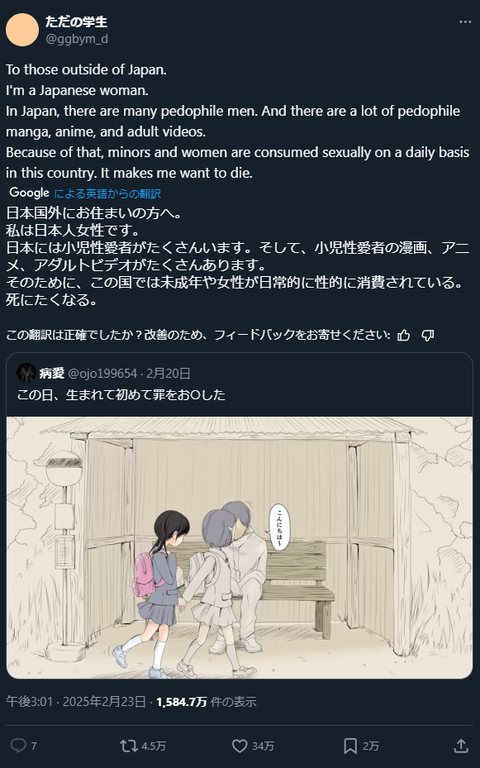 日本人女性「日本の男はロリペドの変態しかいなくて死にたくなる」←海外でバズって33万いいね突破!