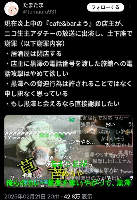 【悲報】カレー蕎麦で炎上した「cafe&barよう」店主、土下座謝罪をするもニコ生主ではなく個人情報を漏らした旅館「旅の宿 梅本」に向けてだった模様