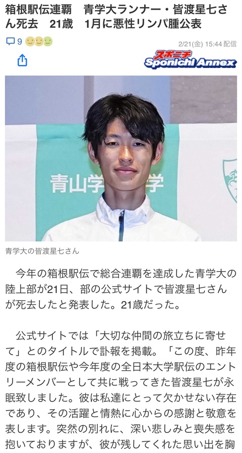 【訃報】青学大箱根メンバー皆渡星七さん、21歳で逝去 1月に悪性リンパ腫公表 原晋監督「早すぎる…」