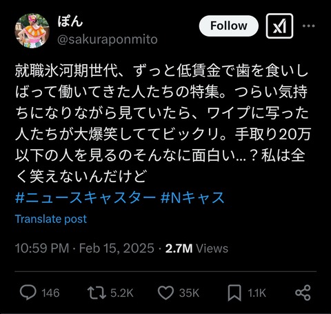 【悲報】TBSのコメンテーター、氷河期世代特集で爆笑してしまい炎上?