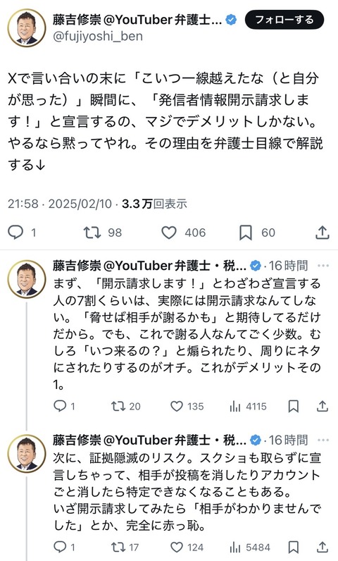 【朗報】弁護士「開示請求するぞ!と宣言してるやつは7割がただの脅しです」