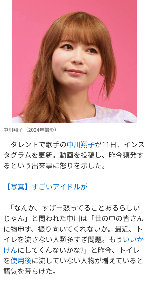 【悲報】中川翔子さん、ブチギレ「ウンチを流さない人が多すぎる?」