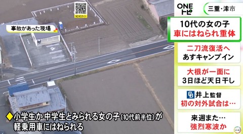 【三重】“道路に飛び出した”との情報も…小中学生とみられる女の子が車にはねられ意識不明の重体 運転の保育士を現行犯逮捕