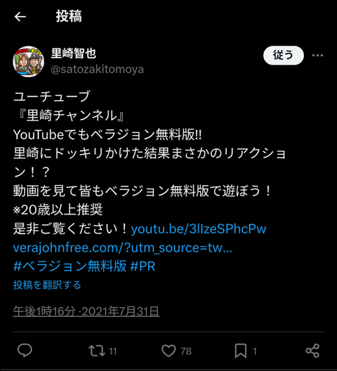 【悲報】里崎智也さん未だに公式Xからベラジョンの宣伝とURLを消していない模様…